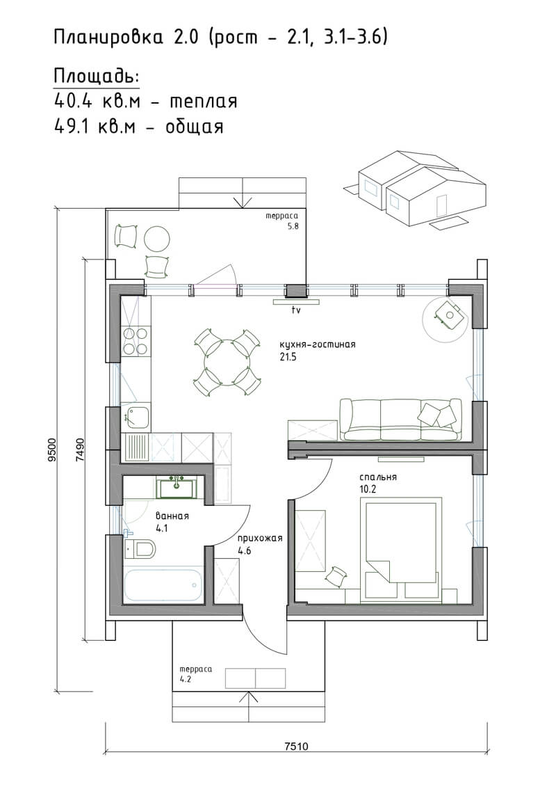 - Габариты дома (ВхШхД): 7.5×7.5×от 9.8 м