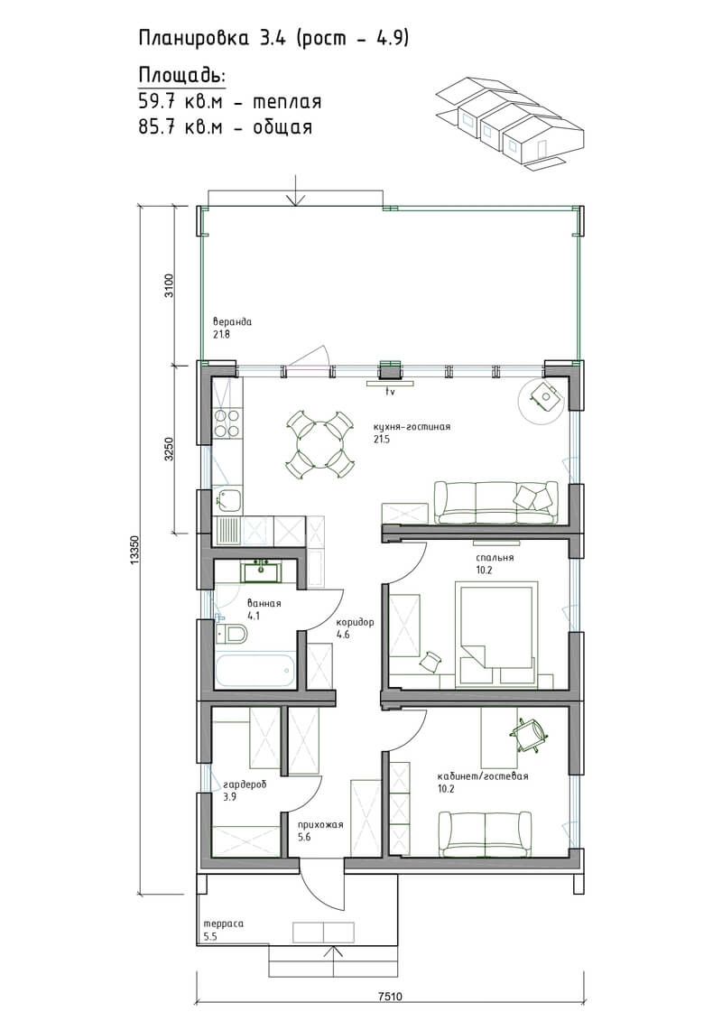 Теплая площадь: 59.7 м²