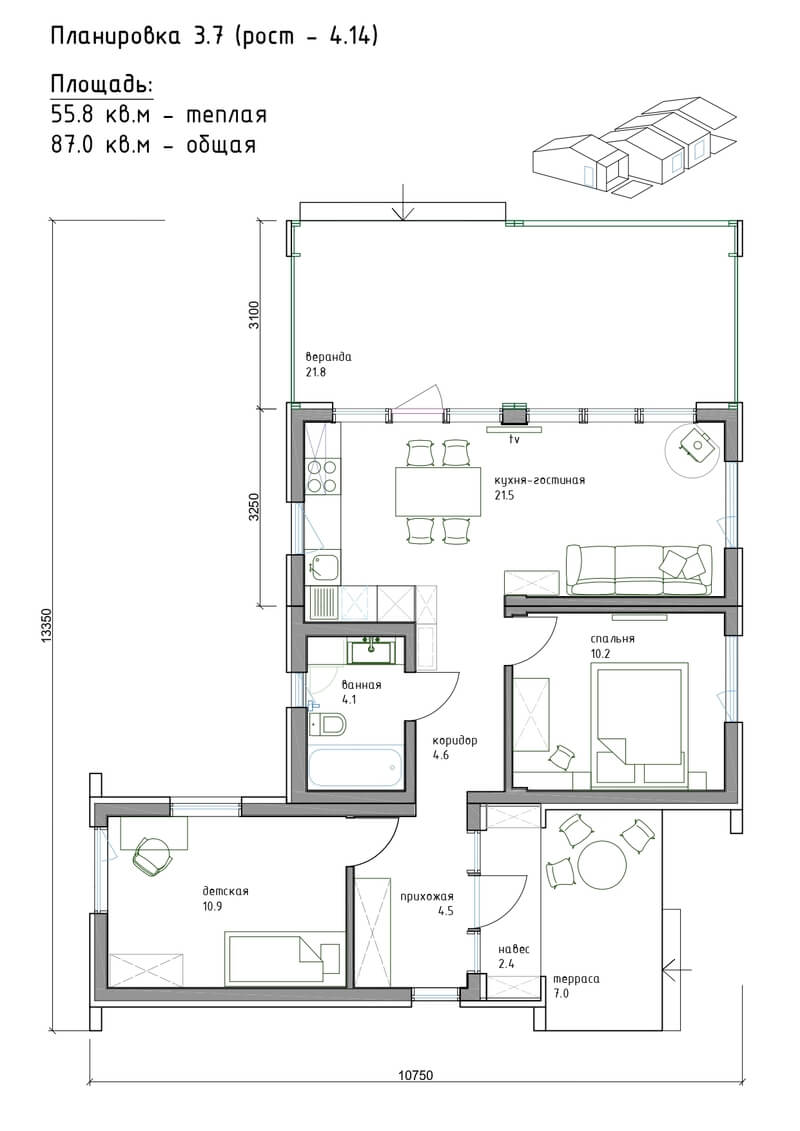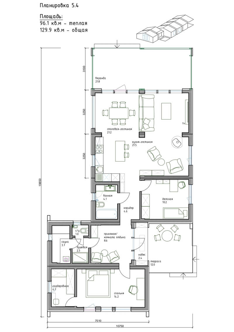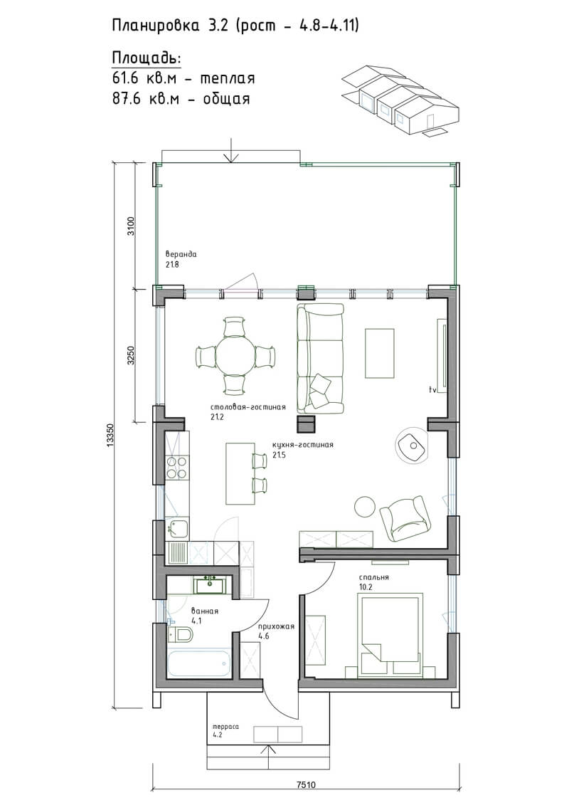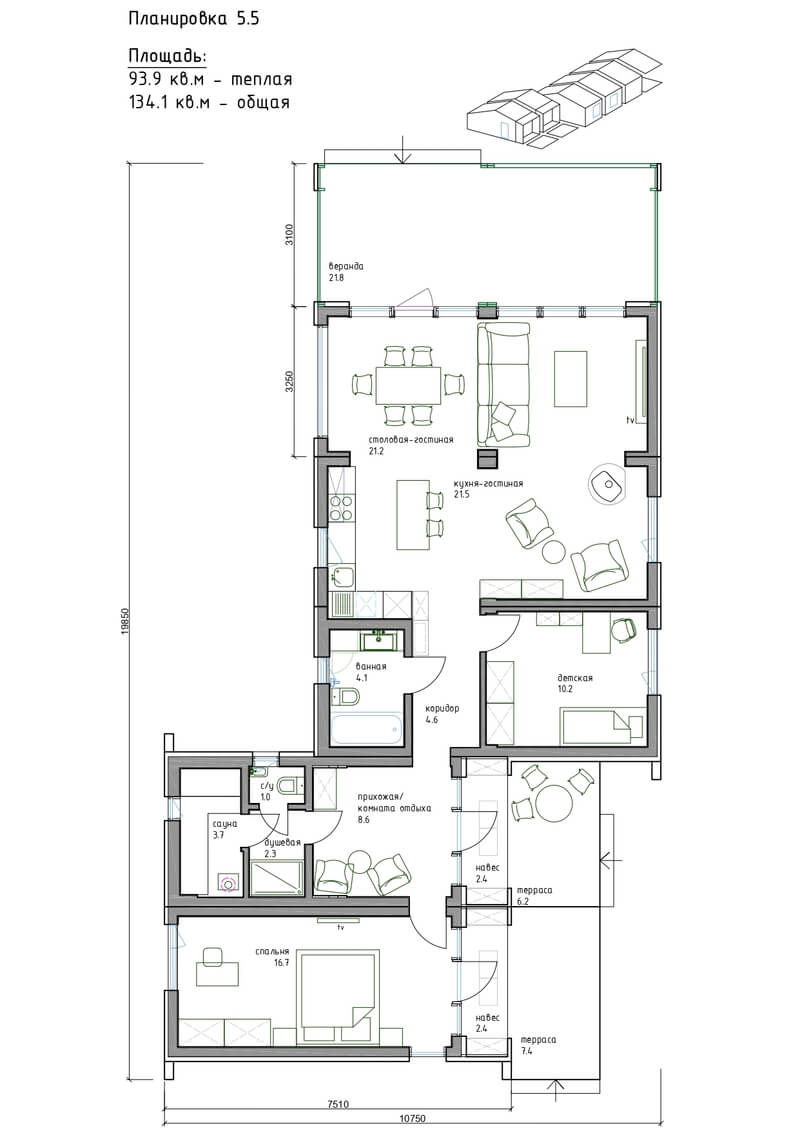 - Общая площадь (включая террасу): 66 - 160 м²
