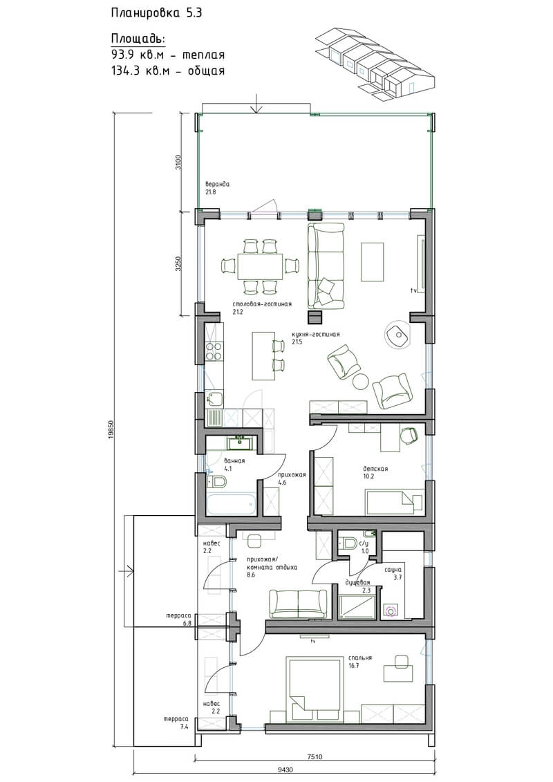 Теплая площадь: 97.5 м²